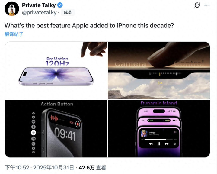 看到外网博主 Private Talky 发布的一个小调查,询问网友:“苹果公司这十年来为 iPhone 添加的最佳功能是什么?” 调查中列出了几个代表性功能:操作按钮、ProMotion、相机控制按钮以及灵动岛,引发了不少讨论。