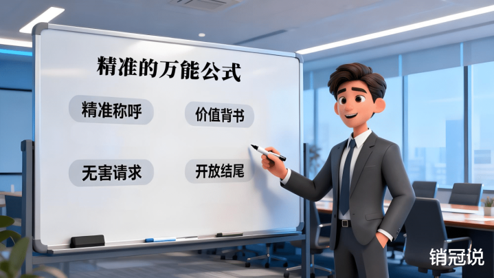 精准的万能公式就在这里,背不下来就抄在墙上。这套方法包含四个部分:精准称呼、价值背书、无害请求和开放结尾。
