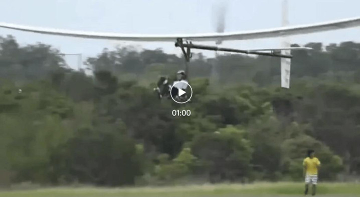 再比如日本学生制造并试飞了一架人力驱动的飞行自行车。它装有巨大的机翼,后方配有一台大型螺旋桨。螺旋桨与脚踏系统相连,骑手在踩动踏板时便能驱动它旋转。