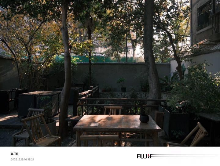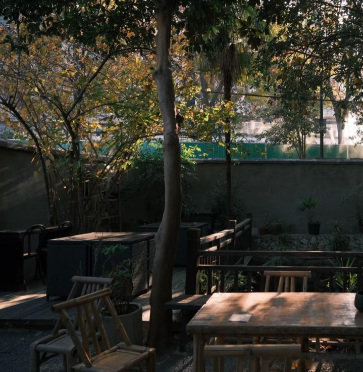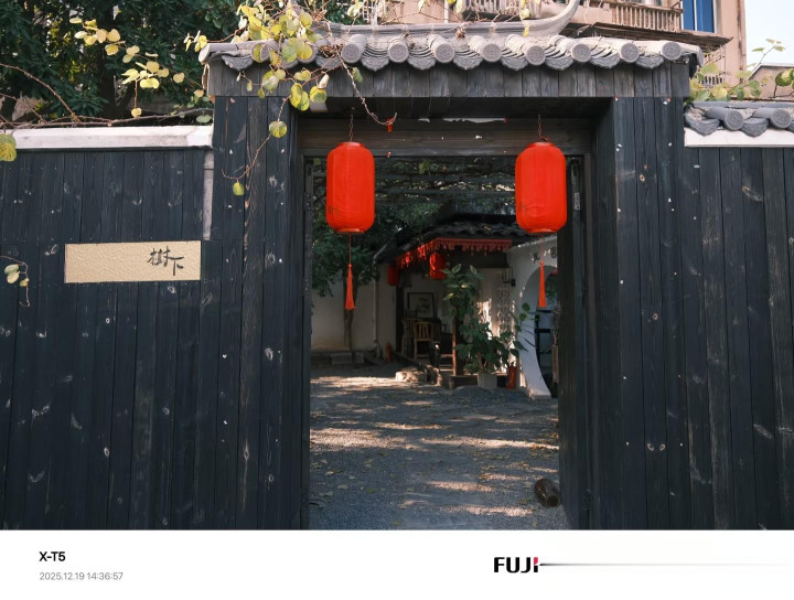 镜头里的小院,远比想象中阔绰且诗意。黑木门框上挂着红灯笼,门旁石牌刻着“树下”二字,推门而入,碎石铺就的小径蜿蜒向前,一侧是爬满藤萝的廊架,一侧是嵌着“玉园”二字的白墙圆拱门,拱门后摆着古朴的陶缸,缸里养着绿植,旁边的木质桌椅隐在高大的树木下,阳光只能透过枝叶缝隙,洒下斑驳的光点。