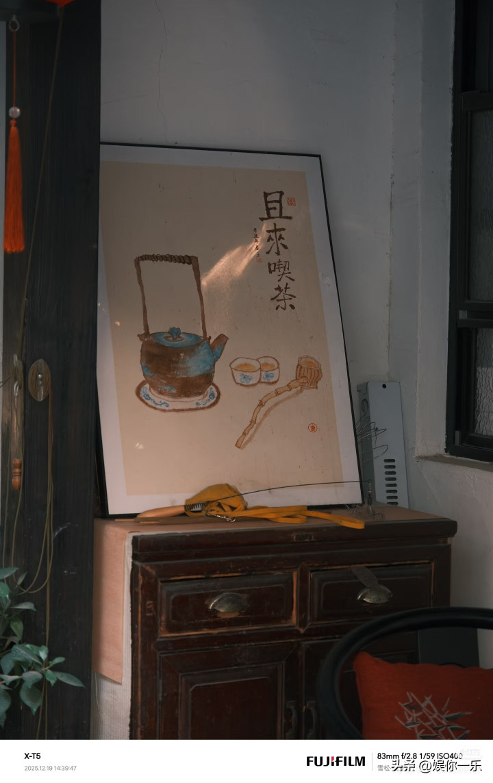 墙上挂着“且来吃茶”的书画、喜鹊登梅的卷轴,老旧的木柜上摆着茶具,处处透着主人对清净雅致生活的偏爱。