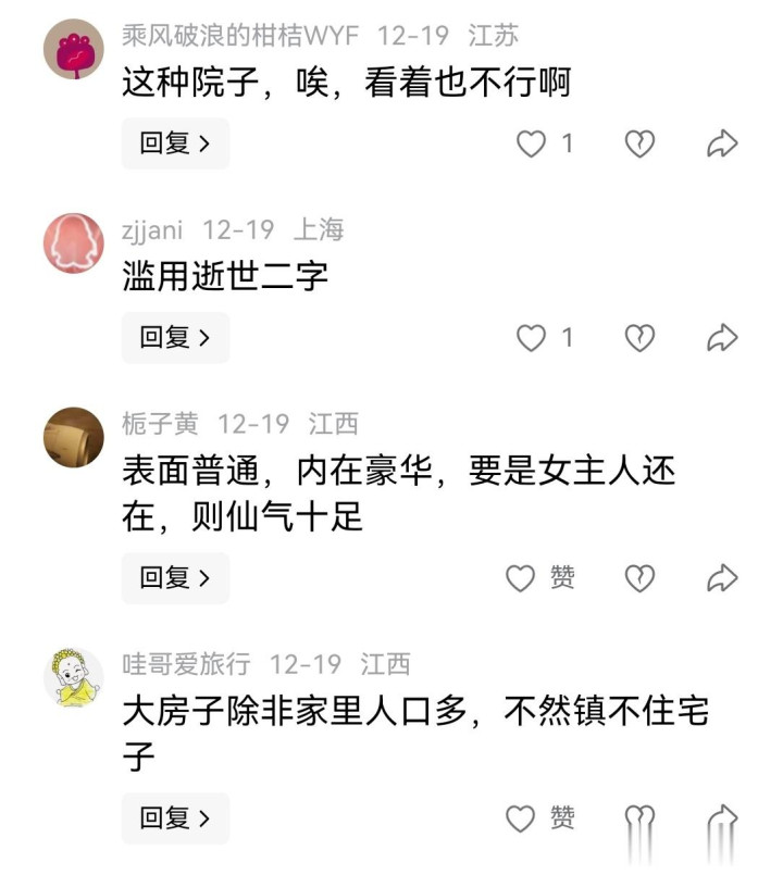 这些言论让原本满是生活气息的小院,仿佛成了被审视的“标本”,连角落里的青苔、池边的杂草,都被解读成了“人气不足”的证据。